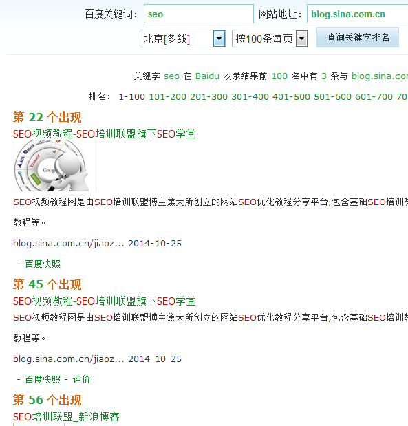 再比如前不久一个人咨询我的事情,这个新浪博客seo排名竟然有3个,他最大的疑惑是3个而不是2个或者1个,其实这个背后也是由于搜索的数据缓存还没有完全计算过来造成的,并没有多少奇怪的。