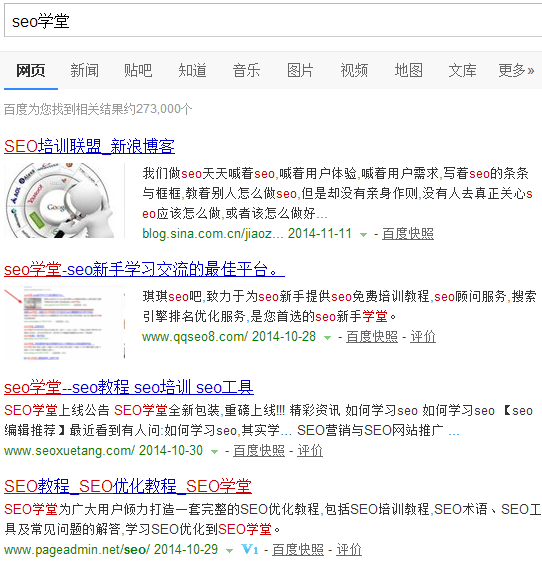 再比如你在百度搜索“seo学堂”,我这个新浪博客竟然排在第一,在这个博客上没有出现过一次seo学堂相关的话题,而下面的很多站标题、描述、文内都出现了很多次: